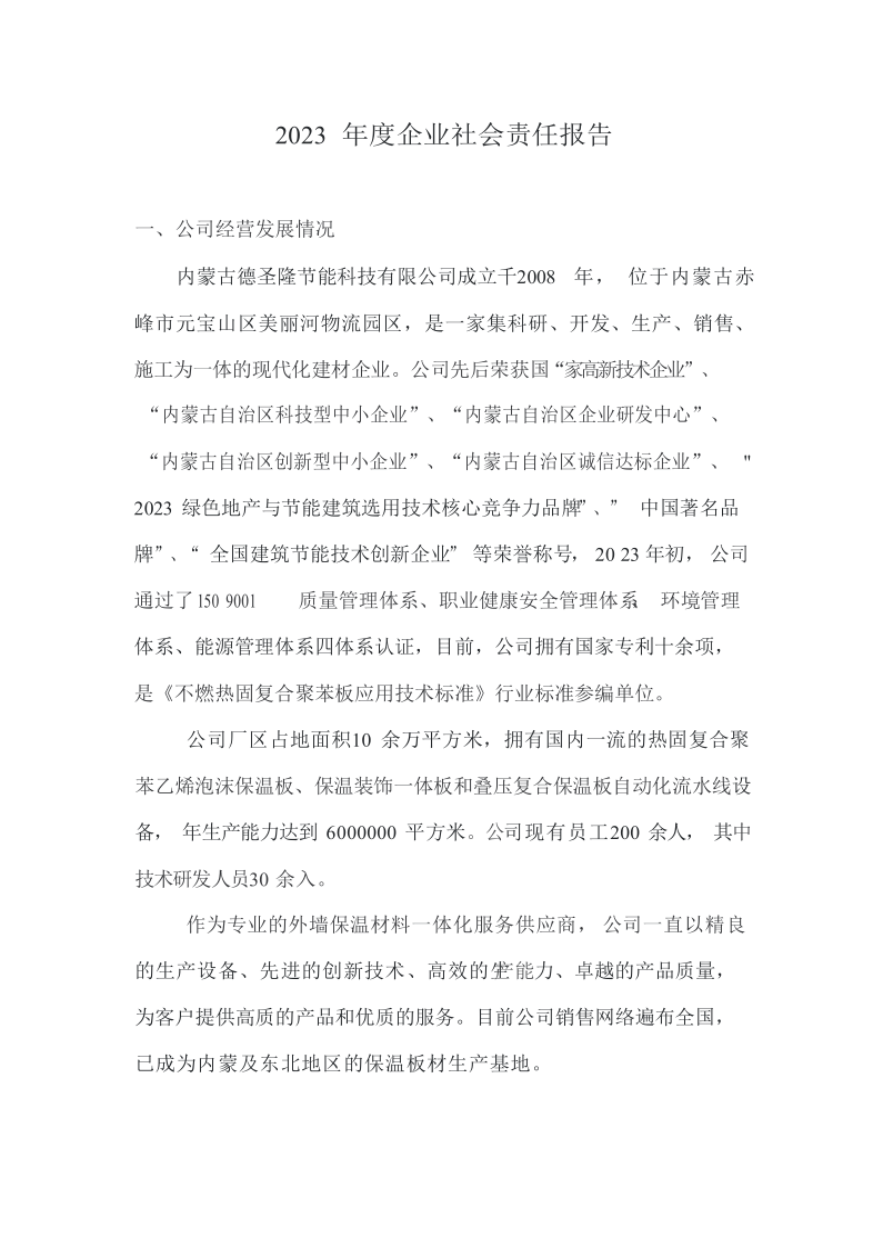 內(nèi)蒙古德圣隆節(jié)能科技有限公司成立于2019年,位于內(nèi)蒙古赤峰市元寶山區(qū)美麗河鎮(zhèn)物流園區(qū),是一家集科研、開發(fā)、生產(chǎn)、銷售、施工為一體的現(xiàn)代化建材企業(yè)。公司主營產(chǎn)品:熱固復合聚苯乙烯泡沫保溫板、保溫裝飾一體板和泡沫混凝土保溫板,年生產(chǎn)能力達到6000000平方米。